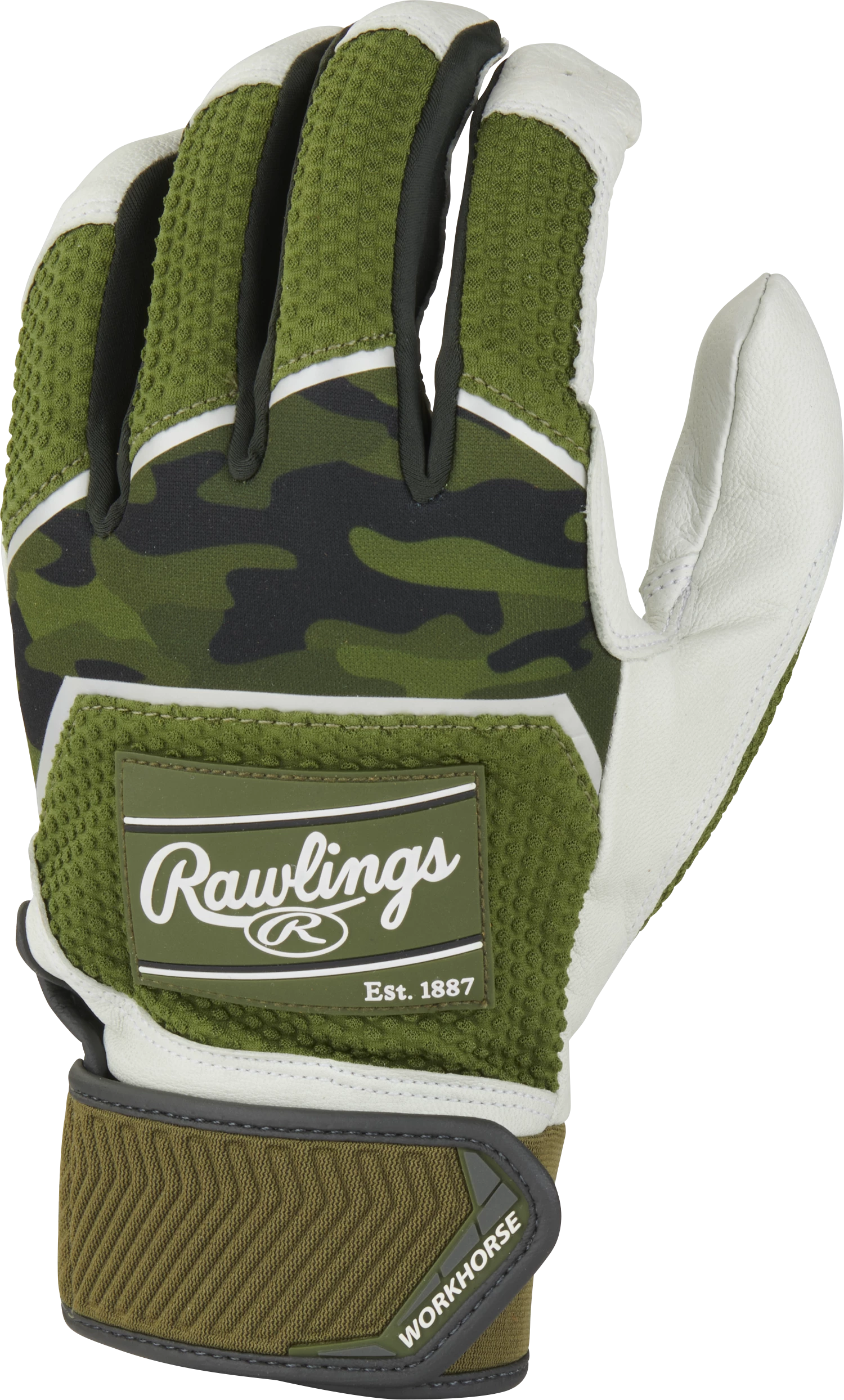 Raise your game up to the next level with the Rawlings Workhorse CAMO batting gloves. These top-of-the-line batting gloves were meticulously constructed with a durable Oiltac leather palm. This gives you incredible durability and performance, so you can have superior bat control with every swing.